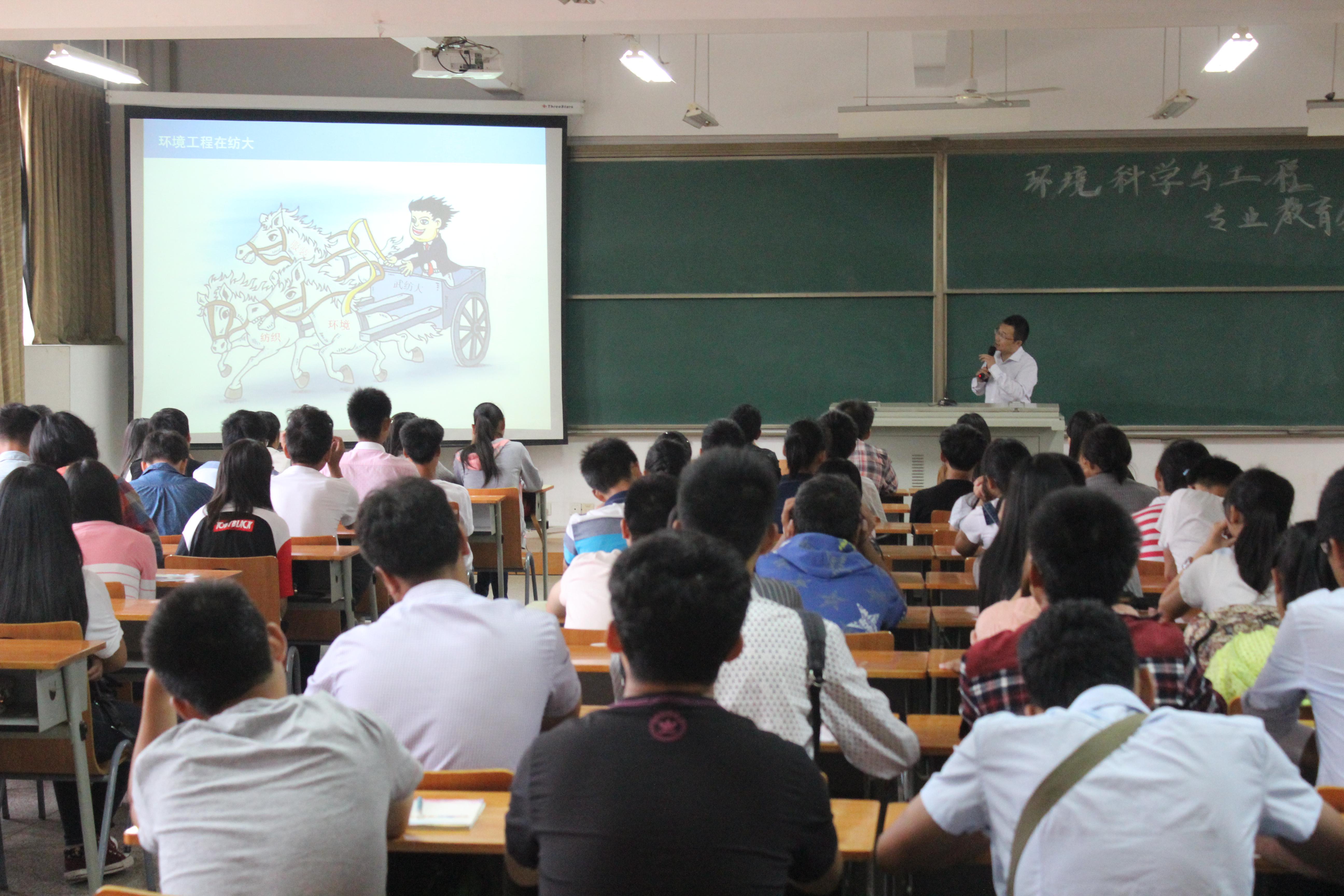 “你了解环境专业吗?”“你知道环境科学与工程的就业前景吗?”在环境专业教育的讲座上,夏东升院长介绍了环境专业的设置情况、专业分类、就业情况等,鼓励新生树立远大目标,制定学习计划,规划好人生道路。潘飞、曹刚老师分别进行了大气污染处理、印染污水处理主题讲座。环境11502班任运东同学说“经过专业老师的耐心讲解,我对专业有了更清楚的认识,也明确了未来的发展方向。”