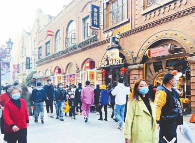 步行街上打卡逛街市民不少。