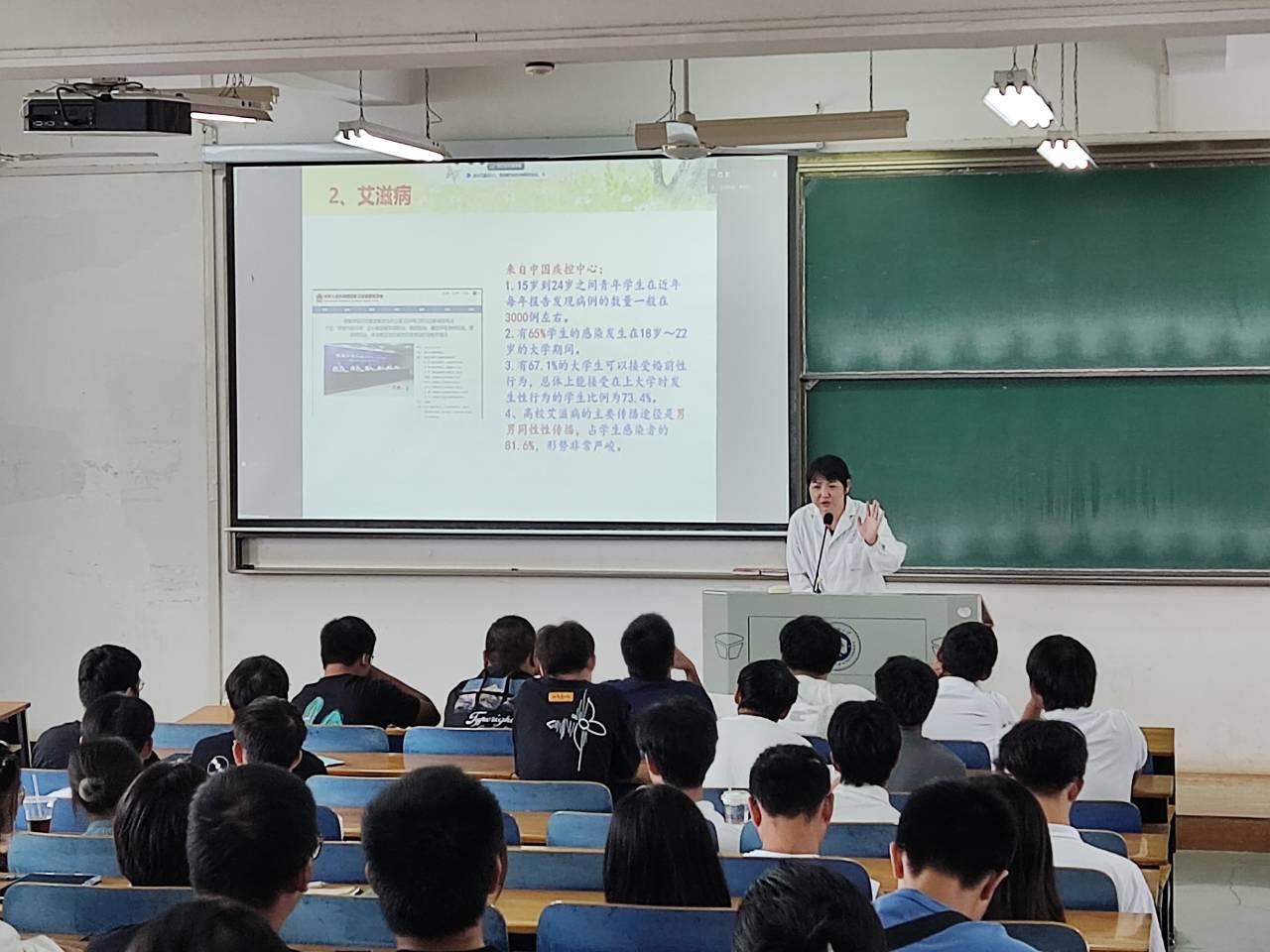 舒医生从大学生医保政策及医疗管理解读、急救知识、“防艾、防新冠、防肺结核”传染病知识等方面为同学们作了介绍,提醒大家在新的学习生活中,要加强体育锻炼、规律饮食,增强自身免疫力。