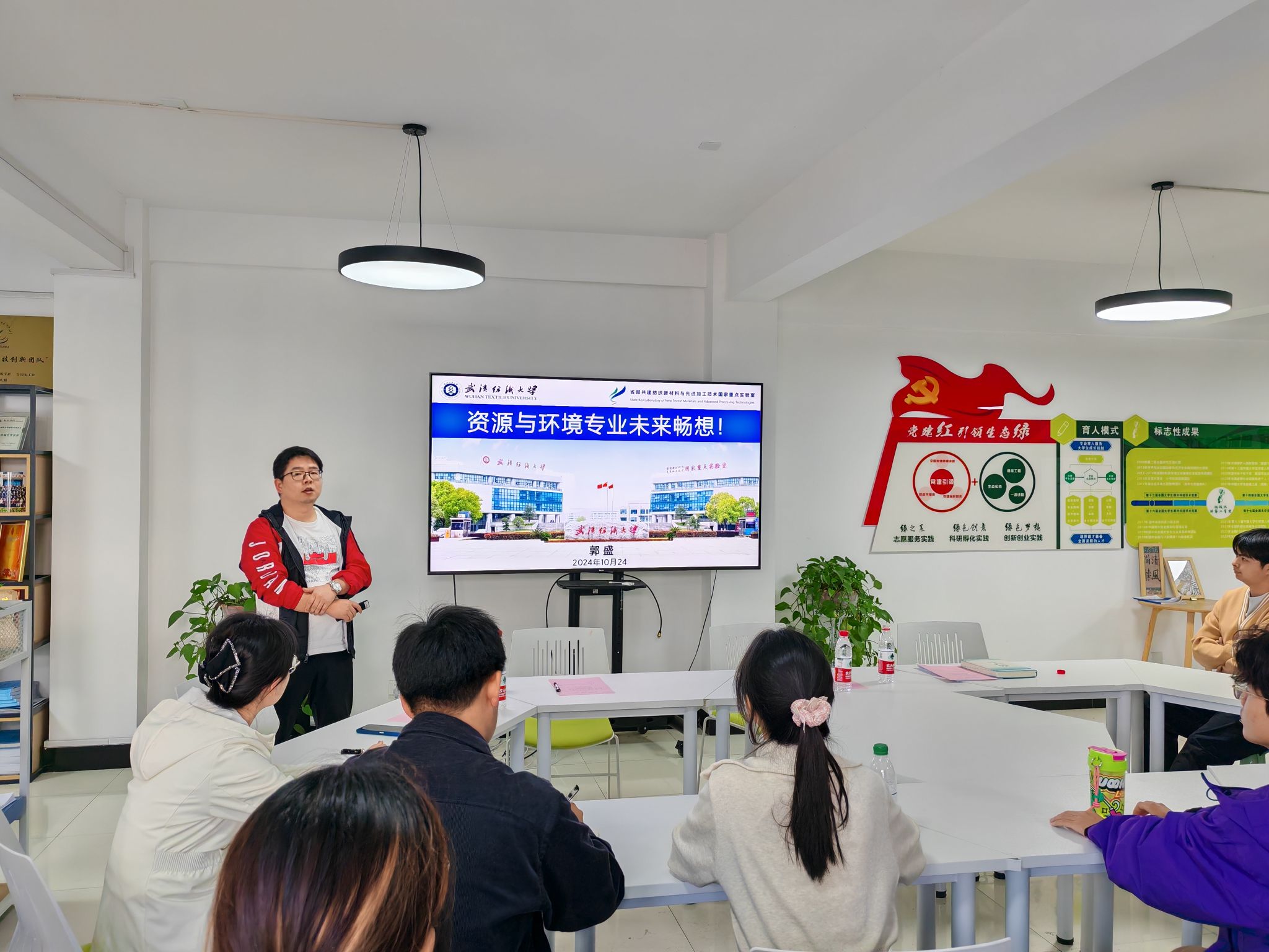 为深入学习贯彻党的二十大精神,大力弘扬科学家精神、涵养优良学风,营造良好的一站式育人文化氛围,10月24日下午,资环学院邀请2024年度“全球前2%顶尖科学家榜单”入选者、省部共建纺织新材料与先进加工技术国家重点实验室特聘教授,给排水科学与工程系郭盛老师来到十栋“绿芽”创新实践学生服务驿站开展“资环专业未来发展畅享”专题交流活动。学校学工部部长张莎莎、学院党委副书记、辅导员及各年级学生代表参加讲座。