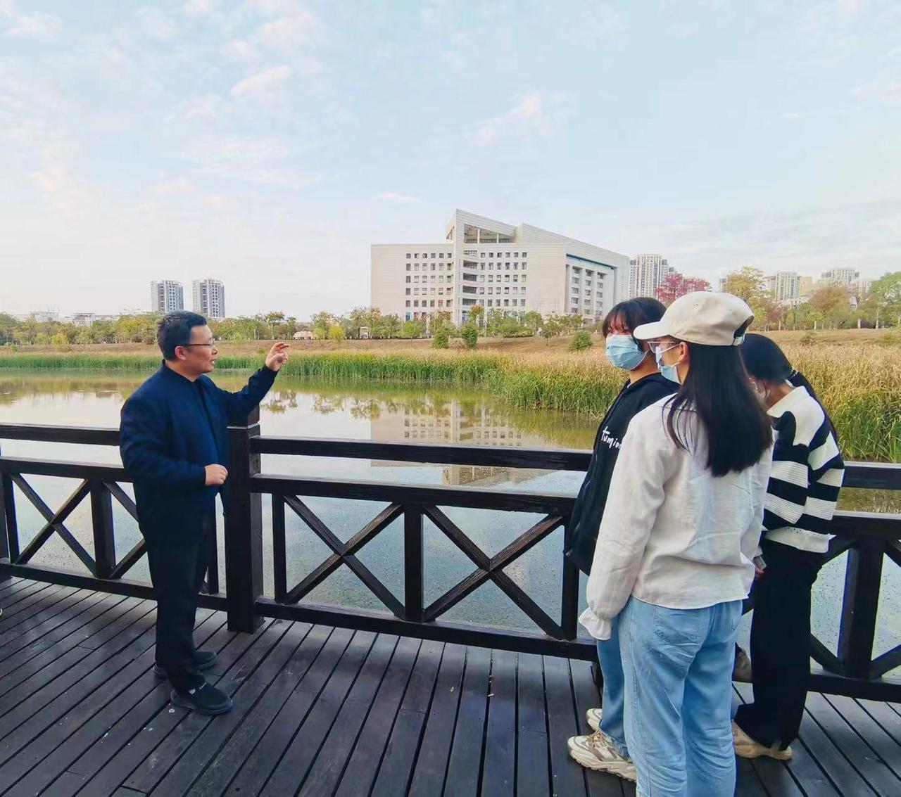 “流水如有意,暮禽相与还,同学们看夕阳下的中锦湖中要正在打盹的绿头鸭、枝头上有探头探脑的灰喜鹊,它们都是湿地生态系统中的组成部分。”11月8日下午,武汉纺织大学环境学院夏东升教授带领湿地保护志愿者50余人走进校园内的小微湿地开展观鸟、湿地巡护活动。