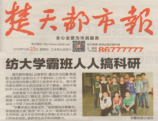 楚天都市报讯(记者罗欣 通讯员冯钰嘉 韩孟君 张丽君)全班23人个个搞科研,已经有一半的学生在国内外核心期刊上发表学术论文。楚天都市报记者昨日从武汉纺织大学了解到,该校环境科学1301班成为了全校闻名的工科学霸班。