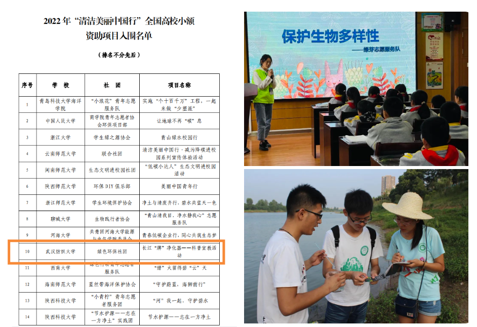 2022年10月,生态环境部宣教中心公布2022年“清洁美丽中国行”全国高校小额资助项目名单,武汉纺织大学绿色环保协会《长江“牌”净化器》从82所高校的134份方案中脱颖而出,入围“20强”,这也是湖北省唯一入选的团队。