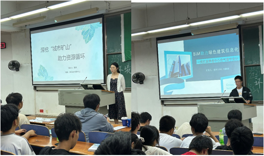 环科12001班张珺同学介绍了作为学院绿色环保协会的一员参加社会实践类竞赛的经验和体会,鼓励大家要勇敢尝试、不怕失败。建环11901班刘鹏刚同学作为学院BIM协会的一员参加设计建模类竞赛的经验和体会,鼓励大家要以赛促学、学以致用。环工12003班周易同学介绍了参加“互联网+”大学生创新创业大赛的经验和体会,对赛前准备、赛中应对做了详细介绍,让大家受益匪浅。