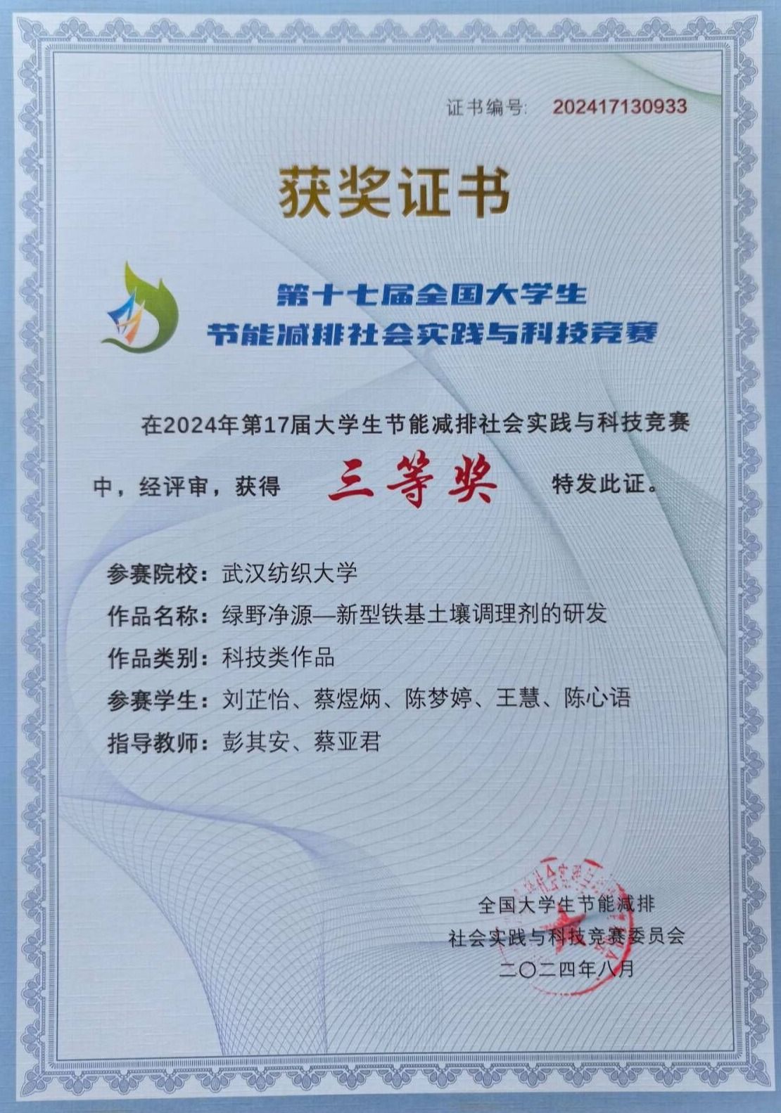 2024年8月19日,第十七届全国大学生节能减排社会实践与科技竞赛公布了获奖名单,我院环科12201班刘芷怡等作品《绿野净源—新型铁基土壤调理剂的研发》、环科12202胡晓等作品《“磷离尽致”—固废基地聚物底泥活性覆盖材料关键制备及应用》、环科12201郑欣等作品《荆州古城旅游区节能减排现状及改进建议》获得国家三等奖。