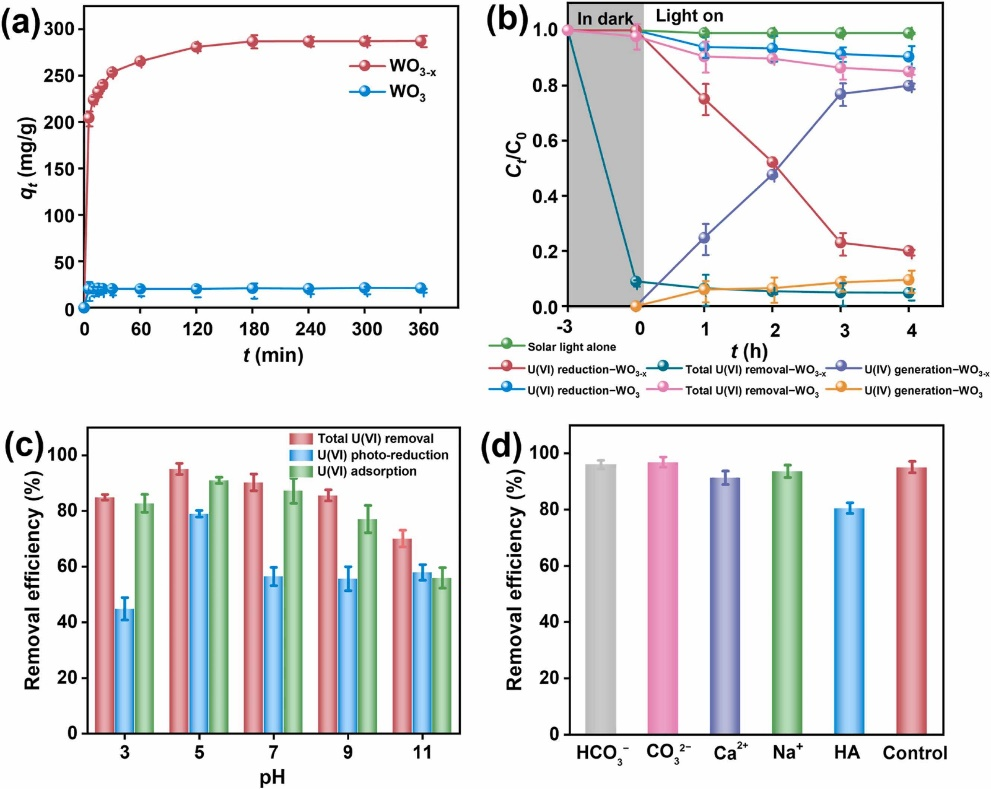 Fig. 4. (a) Adsorption kinetics of U(VI) by WO3-x and WO3; (b) photocatalytic removal of U(VI) and formation of U(IV) by WO3-x and WO3 under simulated solar light; (c) effect of pH on U(VI) adsorption and photocatalytic reduction by WO3-x; (d) effect of coexisting ions and HA on U(VI) removal by WO3-x under simulated solar light. (Experimental conditions: catalyst dosage = 0.2 g/L, pH = 5 ± 0.1 for (a), (b) and (d); for (a), initial U(VI) concentration = 100 mg/L; for (b), (c) and (d), initial U (VI) = 10 mg/L, solar light intensity = 80 ± 5 mW/cm2; for (d), ions concentration = 5 mM, HA = 5 mg/L).
