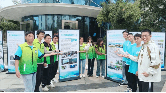 团队成员身着绿马甲,手持宣传标语,向过往师生介绍环保文创、宣传节水知识,分享校园节水行动项目经验,生动的讲解将环保理念传递给每一个人。