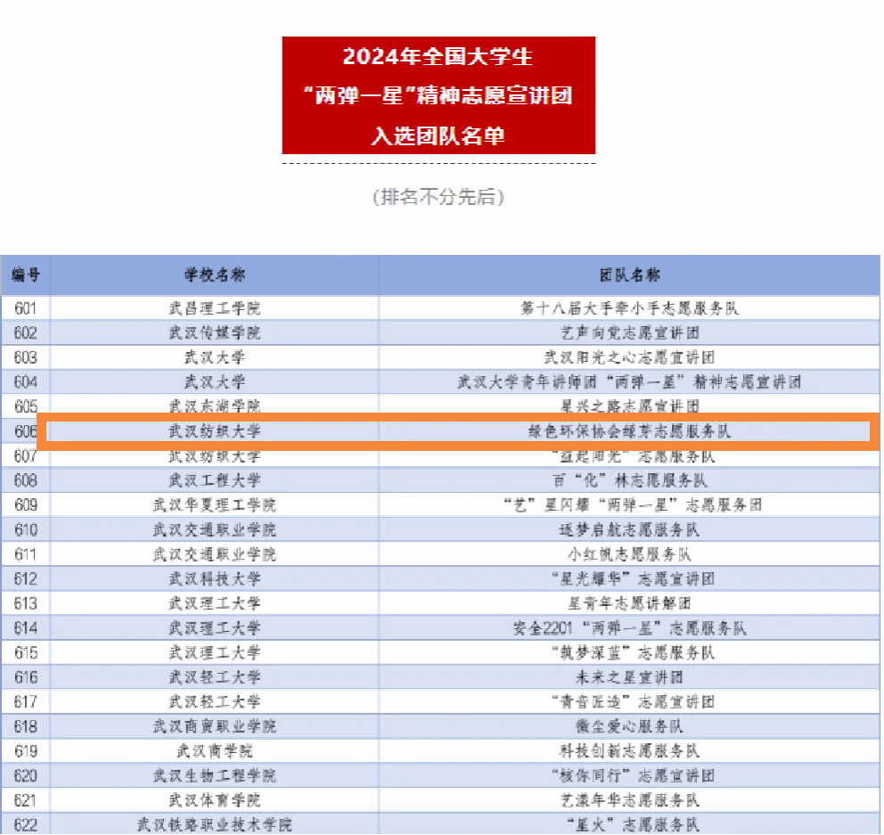 武汉纺织大学绿色环保协会绿芽志愿服务队自成立以来,一直积极活跃在生态科普、环保科创领域。围绕环保科创主题,宣讲团致力于让“两弹一星”知识从“高大上”变得“接地气”,让“两弹一星”精神走进校园和城乡社区,持续实施的环保宣传与教育活动、环保实践与服务活动、环保创新与研究活动三大实践体系,吸引、带动了数千名学生踊跃参与到环保科创中,得到了师生群众的认可!