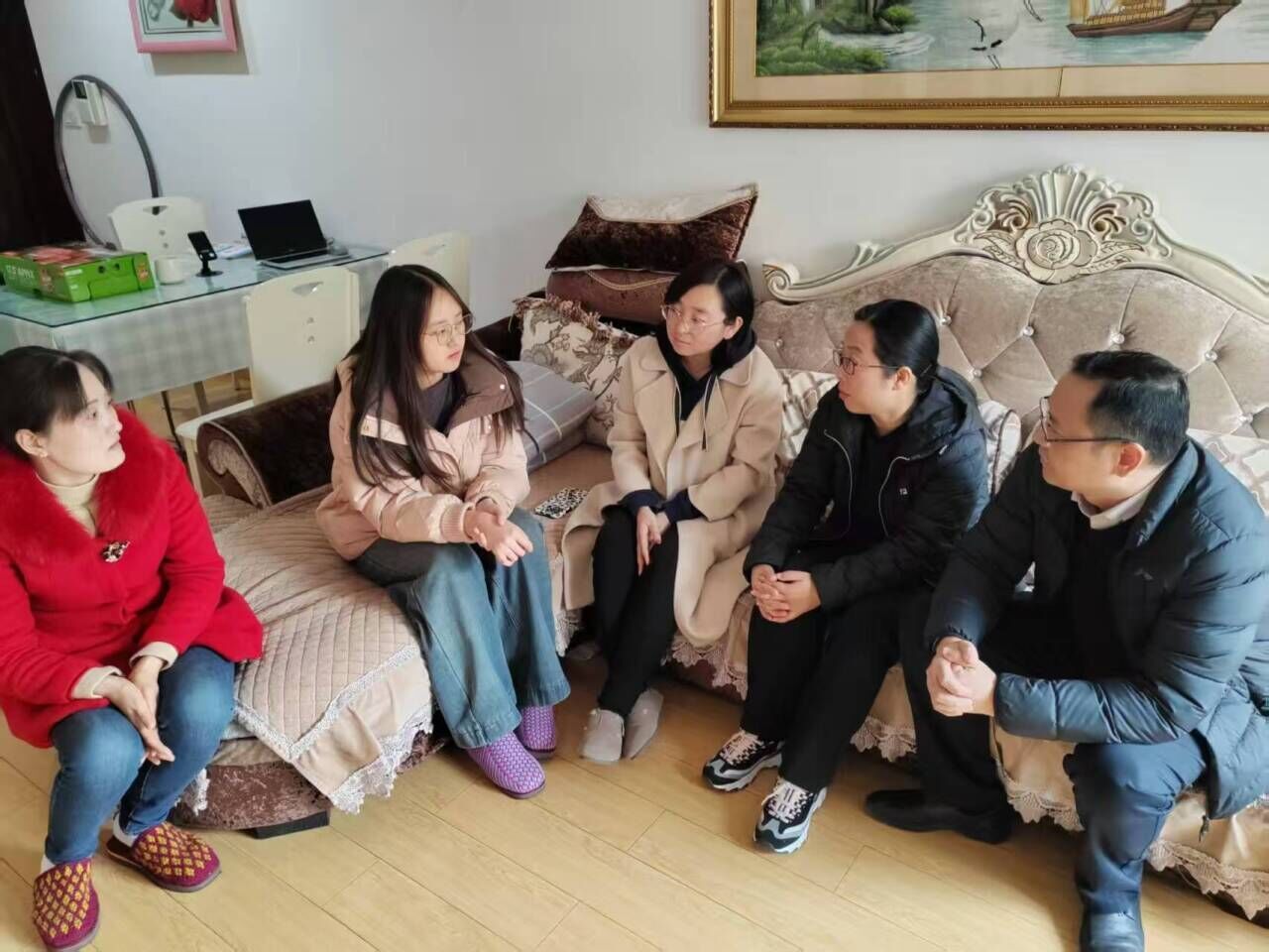 1月10日下午,学院党委书记谢晓萍、党委副书记姚瑶、副院长蔡亚君、24级辅导员毛成兴、孟俊等一行5人,来到了24级学生小焦的家中。学生早早在路边等候,学生家长热情接待了家访老师。