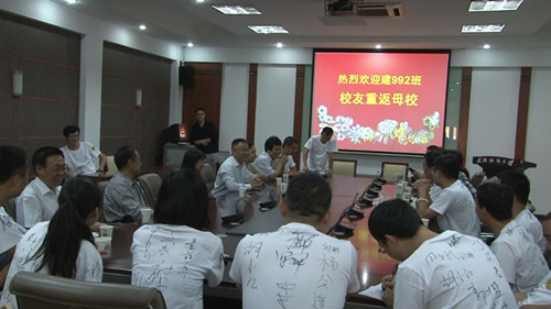 建环992班的校友们穿着统一的白色文化衫,重走了南湖校区昔日就读的教学楼和宿舍,游览了绿树成荫的新校区。校友对学校发生的变化表示赞叹。