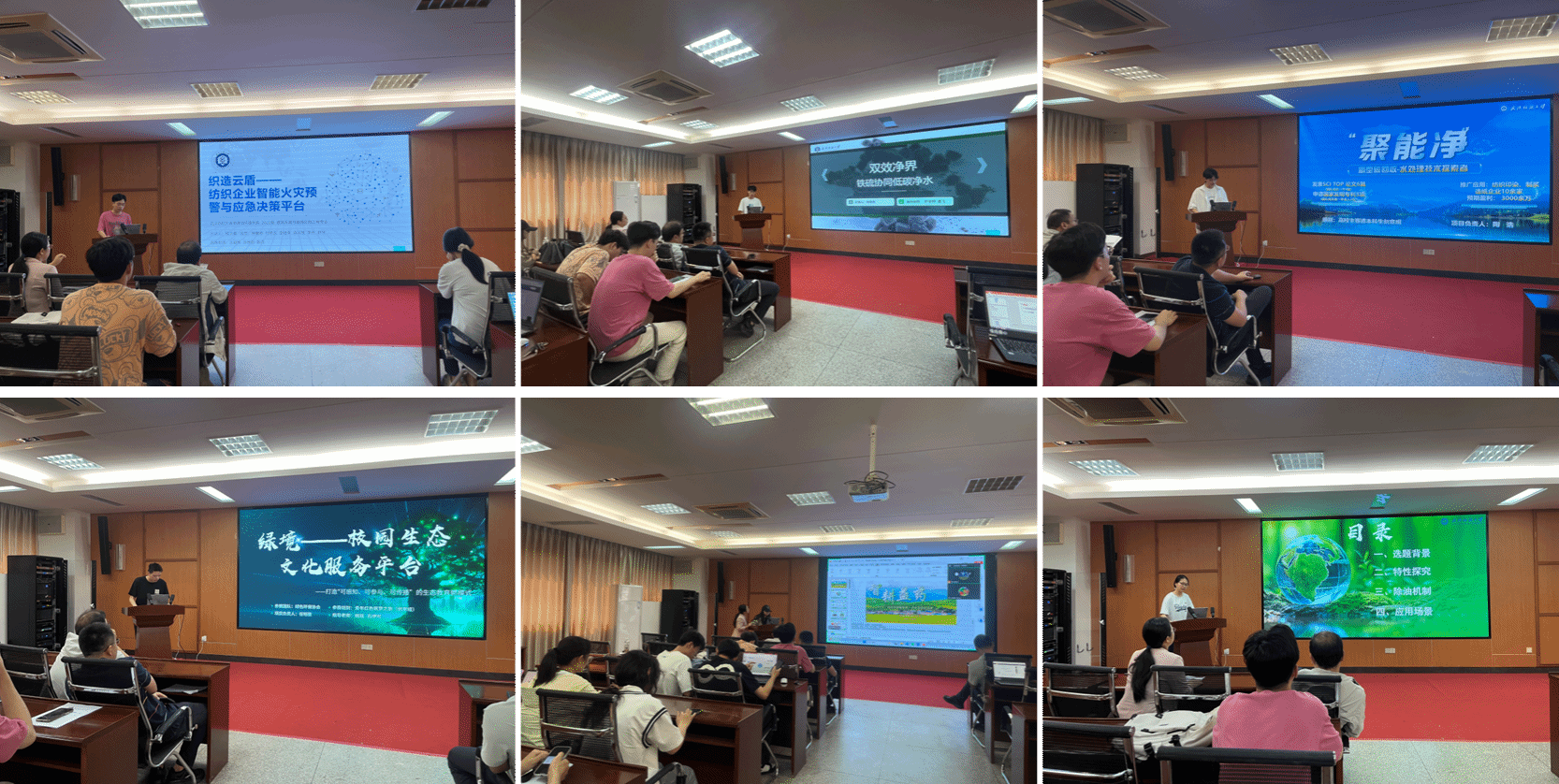 参赛团队依次上台从项目背景、产品/服务介绍、市场分析及定位、商业模式、营销策略、财务分析、风险控制、团队成员等多方面介绍自己的项目。王芮团队介绍了一种基于废旧纤维再利用的高疏水生物炭制备与高效除油减排技术、产品及装置,程文睿团队介绍了一种纺织企业智能火灾预警与应急决策平台,刘龙杰团队介绍了一种铁硫协同低碳净水的技术、产品及装置,余佳梁团队介绍了系列土壤调理剂的研发及在中草药种植地的应用,任明豪团队介绍了一种校园生态解说系统,陶浩团队介绍了一种新型碳回收—水处理技术、产品及装置。