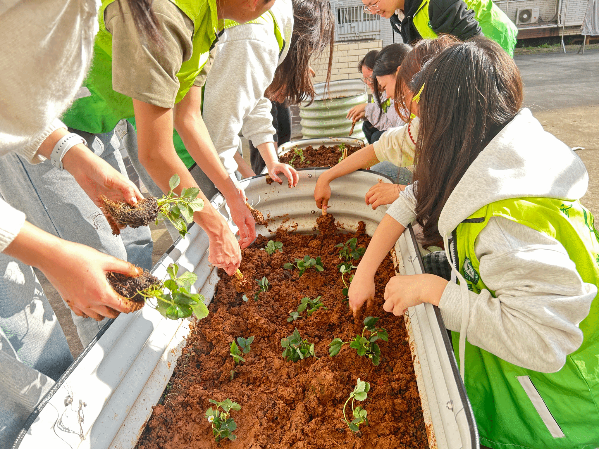 种植活动主要是将草莓苗、番茄苗、西瓜苗等果蔬苗种,薄荷、迷迭香等香草种子种植到劳动教育基地花圃中,从播种到移苗,再到记录植物生长过程,让同学们沉浸式感受劳动乐趣。活动现场暖意融融、井然有序。松土、栽苗、扶正、浇水、播种,同学们分工协作、默契配合,小心翼翼地呵护每一株幼苗,认真播撒每一粒种子。尽管动作略显生疏,但大家专注投入、热情满满。在亲手劳作的过程中,同学们近距离触摸湿润泥土,凝视嫩绿枝芽,真切感受生命破土而出的神奇与力量。