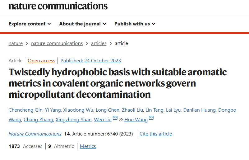 基于此,学院“阳光讲席教授”刘文带领课题组通过在COFs材料中创建有序的π骨架,结合不同孔径大小以及工程亲疏水通道来预设和制造不同的分子界面。与其它材料相比,这些协同作用突破了对有机污染物分子吸附能屏障,促进了内表面更新,所制备的COFs材料实现了对典型抗生素污染物(如左氧氟沙星)的高去除率。研究成果以“Twistedly hydrophobic basis with suitable aromatic metrics in covalent organic networks govern micropollutant decontamination”为题,发表于知名学术期刊Nature Communications上 (论文链接:https://doi.org/10.1038/s41467-023-42513-x)。论文通讯作者为刘文研究员和湖南大学的王侯副教授。