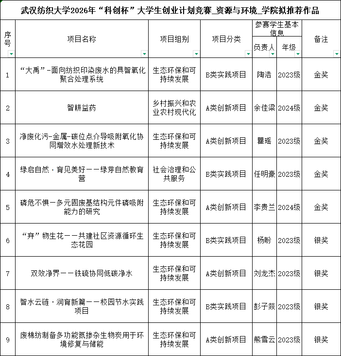 根据《关于开展武汉纺织大学2026年“科创杯”大学生创业计划竞赛的通知》要求,经过学生申报、学院答辩等环节,拟推荐《“大禹”——面向纺织印染废水的具智氧化聚合处理系统》等9件作品参加学校2026年“科创杯”大学生创业计划竞赛。