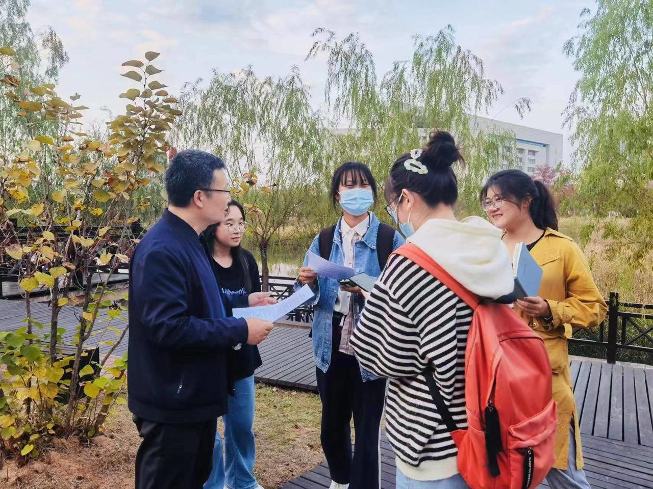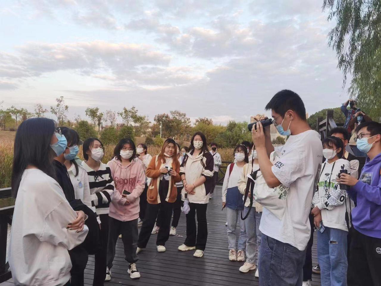 “流水如有意,暮禽相与还,同学们看夕阳下的中锦湖中要正在打盹的绿头鸭、枝头上有探头探脑的灰喜鹊,它们都是湿地生态系统中的组成部分。”11月8日下午,武汉纺织大学环境学院夏东升教授带领湿地保护志愿者50余人走进校园内的小微湿地开展观鸟、湿地巡护活动。