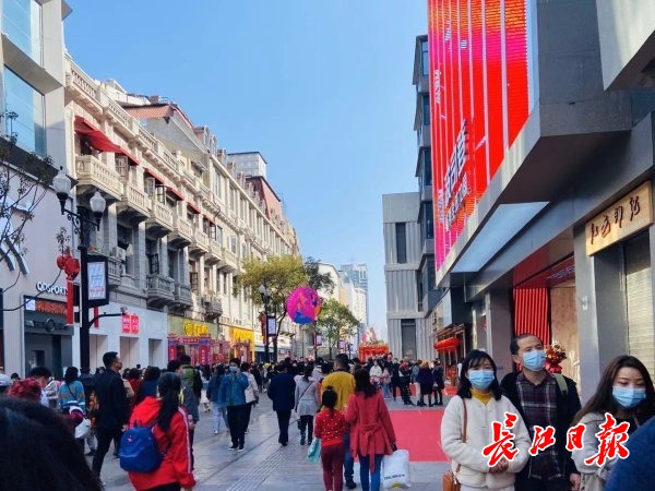 一江之隔的江汉路步行街上春节假期情况如何?16日中午,记者来到江汉路步行街,这里人气同样“旺旺旺”:街道上喜庆的大红灯笼、迎春狮……“中国红”格外抢眼。