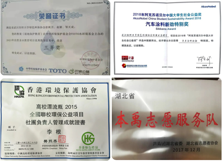 团队曾荣获“阿克苏诺贝尔中国大学生社会公益奖”、“榜样100全国最佳大学生社团”、“全国百强社团”、“全国优秀学生社团”、“全国高校活力团支部”、全国大学生暑期三下乡“优秀团队”、湖北省“社团标兵”、湖北省“大学生优秀社团”、湖北省暑期三下乡社会实践“优秀团队”、湖北省“本禹志愿服务队”“环保公益项目奖”(香港环境保护协会)等国家级省级荣誉30余项。