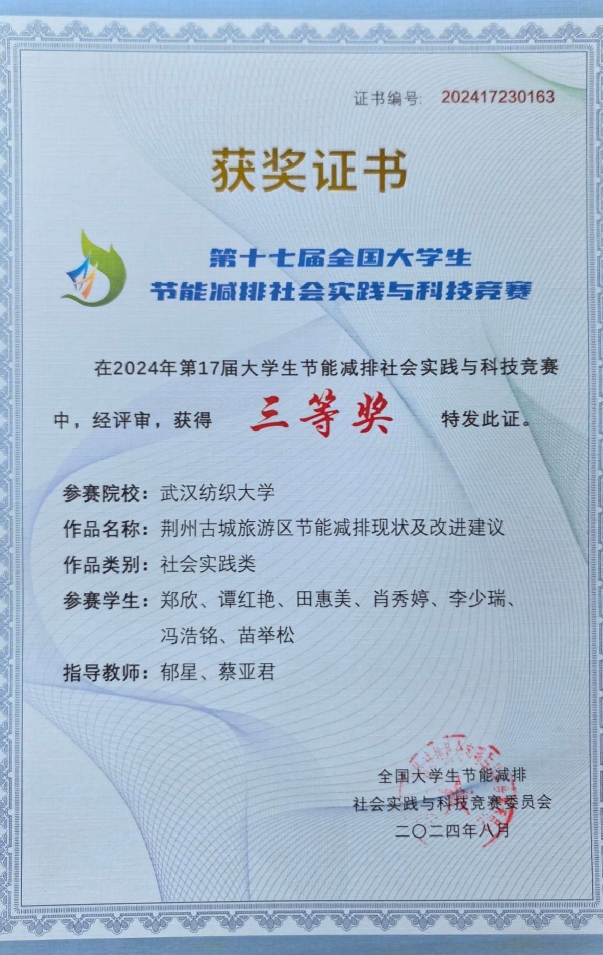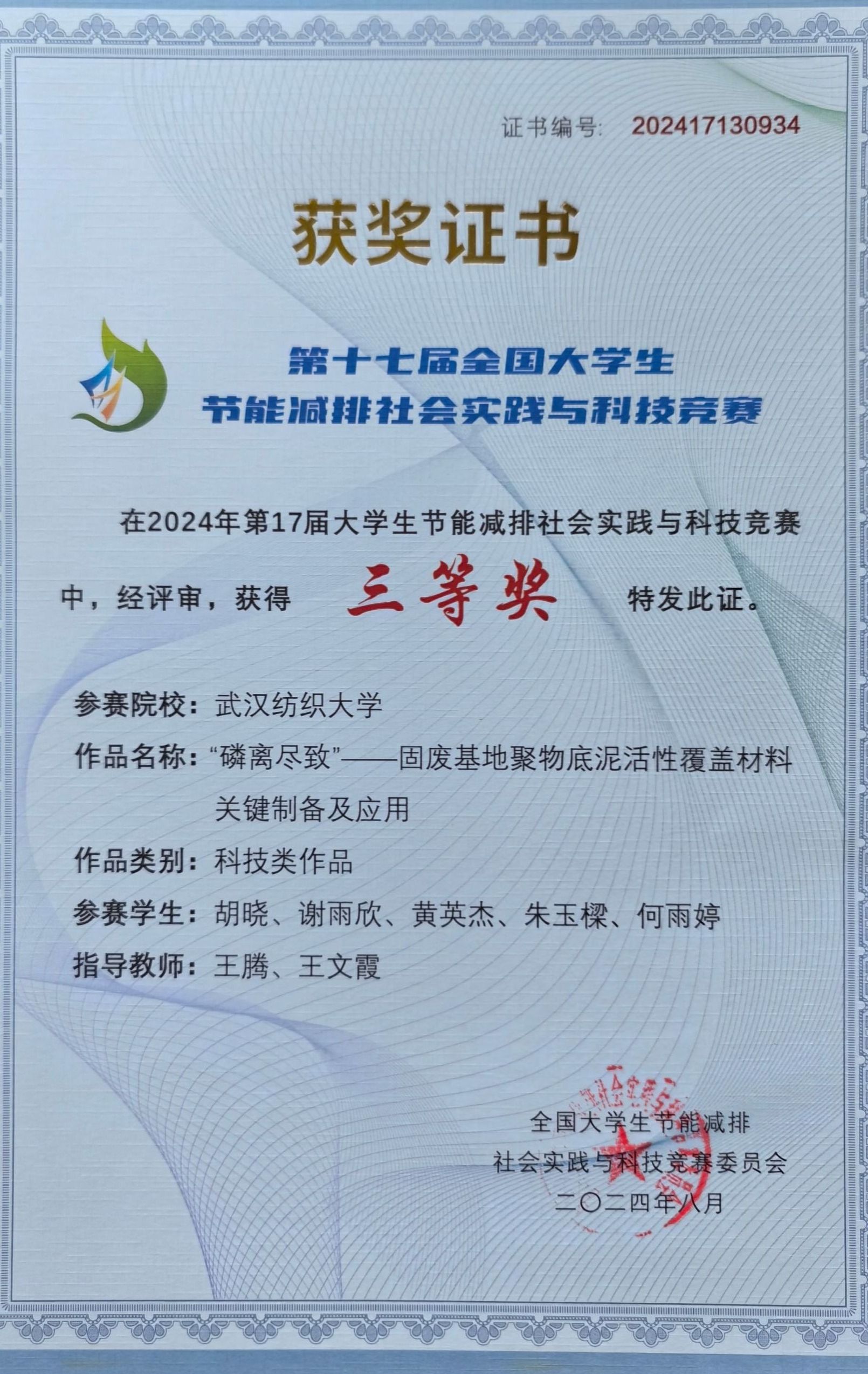 2024年8月19日,第十七届全国大学生节能减排社会实践与科技竞赛公布了获奖名单,我院环科12201班刘芷怡等作品《绿野净源—新型铁基土壤调理剂的研发》、环科12202胡晓等作品《“磷离尽致”—固废基地聚物底泥活性覆盖材料关键制备及应用》、环科12201郑欣等作品《荆州古城旅游区节能减排现状及改进建议》获得国家三等奖。