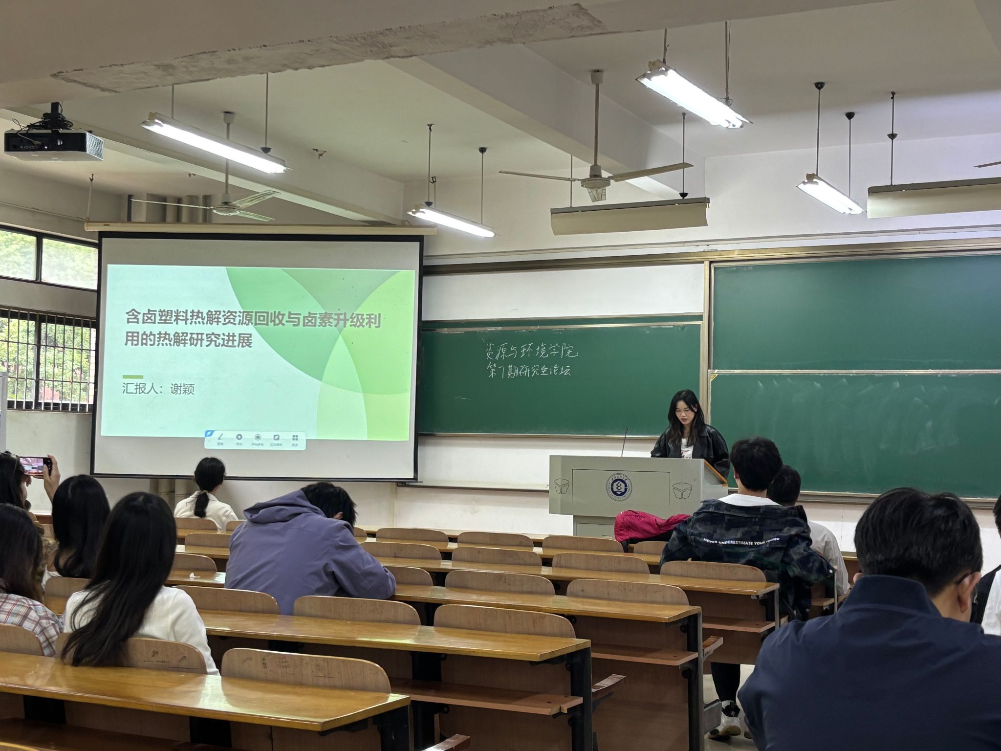 谢颖同学探讨了“含卤塑料资源回收和卤素升级利用的热解研究进展”,展开讲解了各种热解方法处理含卤塑料的原理和方式,例如共热解和催化热解等。废弃卤素塑料有很多潜在回收途径,可以作为高效的除汞吸附剂、金属回收和重金属去除的卤化剂,以及用于新材料的卤素掺杂功能材料。