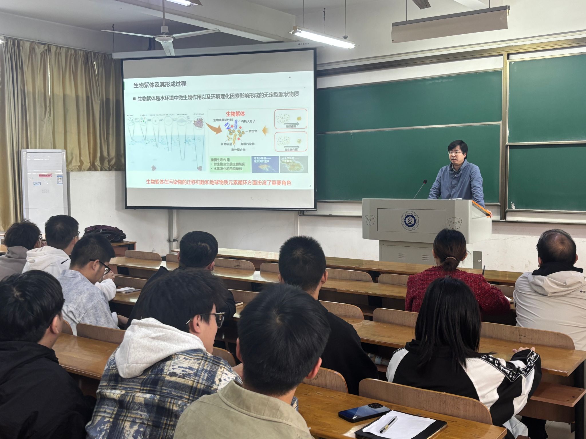 付杰教授从生物絮体及其形成过程和絮体在污染物迁移趋势的作用出发,从前期开展的4个方面的工作,系统的讲述了通过微生态系统与污染物之间的相互作用,强化生态修复和污染生物处理的过程。对“影响絮体形成的机制”、“调控微生物群落原理”和“微生物资源开发利用”三个科学问题进行了详细的报告。报告结束后,参会师生针对讲座内容进行踊跃提问,付杰教授对这些问题进行了细致解答。