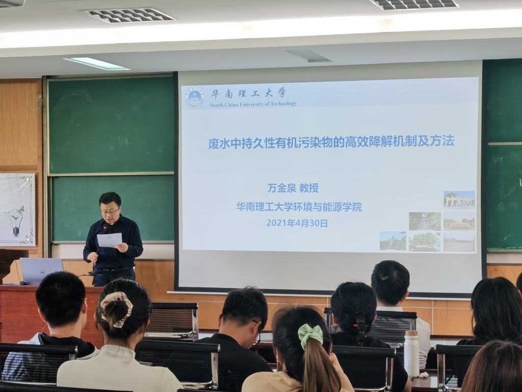 夏东升院长代表学院对万金泉教授的到来表示热烈的欢迎,并简要介绍了其研究方向和科研成果。万金泉教授以“废水中持久性有机污染物的高效降解机制及方法”为题目,报告了废水中持久性有机污染物(POPs)对水处理及生态环境的影响现状,围绕采用过硫酸盐(PS)无酸高级氧化技术深度降解POPs的基础科学问题,从硫酸根氧化自由基(SO4−•)与废水中POPs的降解关系、SO4−•的可控释放、具有靶向识别功能MOFs催化剂的组装及MOFs宏量合成四个方面进行深入探讨。报告对于加深人们对废水中POPs的深度消除的科学认识具有重要意义。该报告深入浅出、精彩纷呈,参与的相关教师和学生开展了热烈的讨论,为师生提供了一次难得的学习和交流机会,有助于师生进一步了解废水处理领域的前沿动态,开拓学术视野。