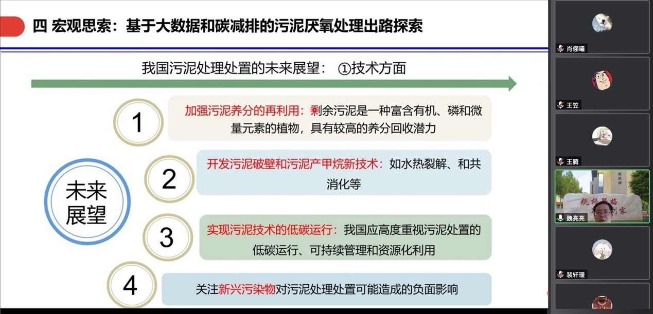 10月7日下午,学院在线上举办了学校第224期阳光论坛。本次论坛邀请了哈尔滨工业大学魏亮亮教授作了题为“城镇污泥高效厌氧处理及资源/能源回收”的报告。论坛由裴轩瑗博士主持,学院教师和研究生参与了此次论坛。