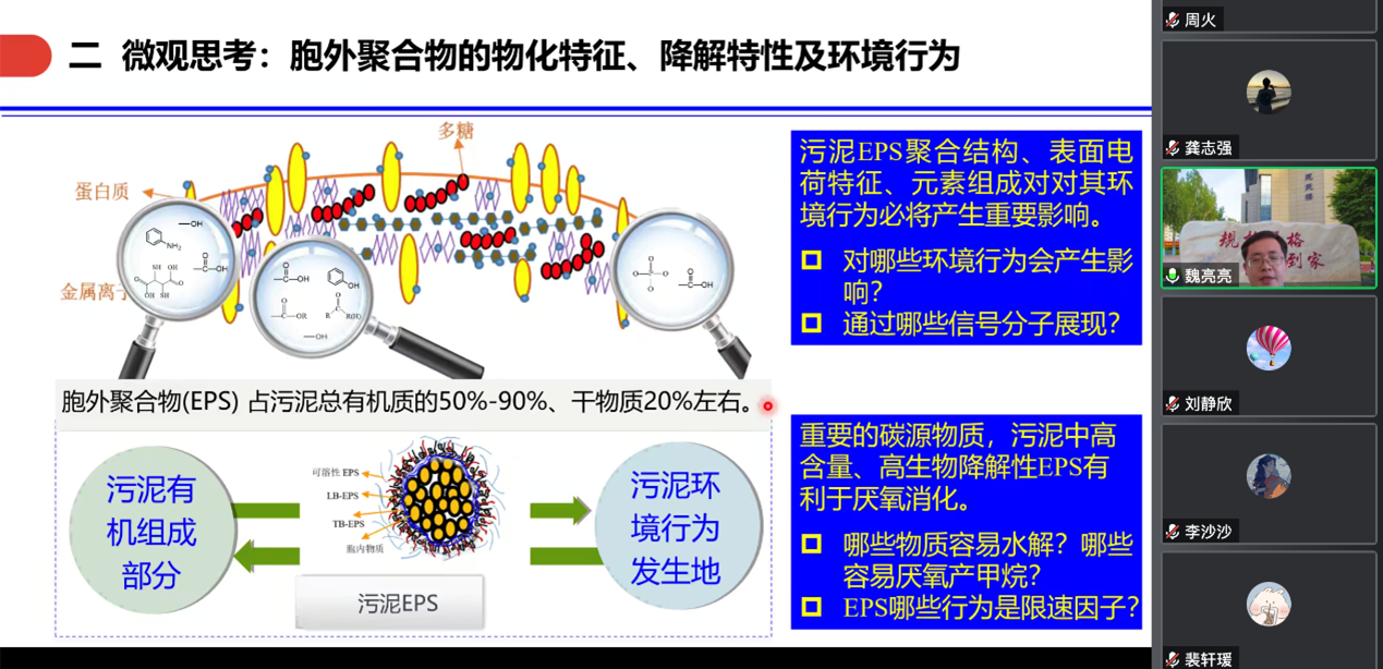 魏亮亮教授在基于城镇污水处理处置及资源能源回收利用的研究背景下分析了在微观上胞外聚合物的物化特征、降解特性及环境行为。结合污泥EPS聚合结构、表面电荷特征、元素组成分析了其对环境产生的影响;同时探索了厌氧消化过程中胞外聚合物的降解特性,探索了在多介质非均相复杂体系下制备生物燃气强化传质以及运用生物炭强化厌氧消化产甲烷的效能及机制;最后在宏观层面上提出了基于大数据和碳减排分析,探索污泥厌氧处理的出路。