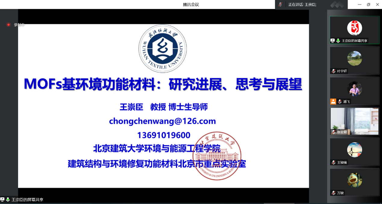 11月30日下午,环境工程学院在线上举办第271期阳光论坛。本次论坛邀请了北京建筑大学王崇臣教授作了题为“MOFs基环境功能材料:研究进展、思考与展望”的报告。论坛由院长潘飞教授主持,学院教师和研究生参与了此次论坛。