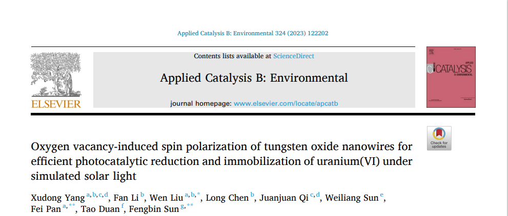 Xudong Yang, Fan Li, Wen Liu, Long Chen, Juanjuan Qi, Weiliang Sun, Fei Pan, Tao Duan, Fengbin Sun. Oxygen vacancy-induced spin polarization of tungsten oxide nanowires for efficient photocatalytic reduction and immobilization of uranium(VI) under simulated solar light. Appl. Catal. B, 2023, 324, 122202.