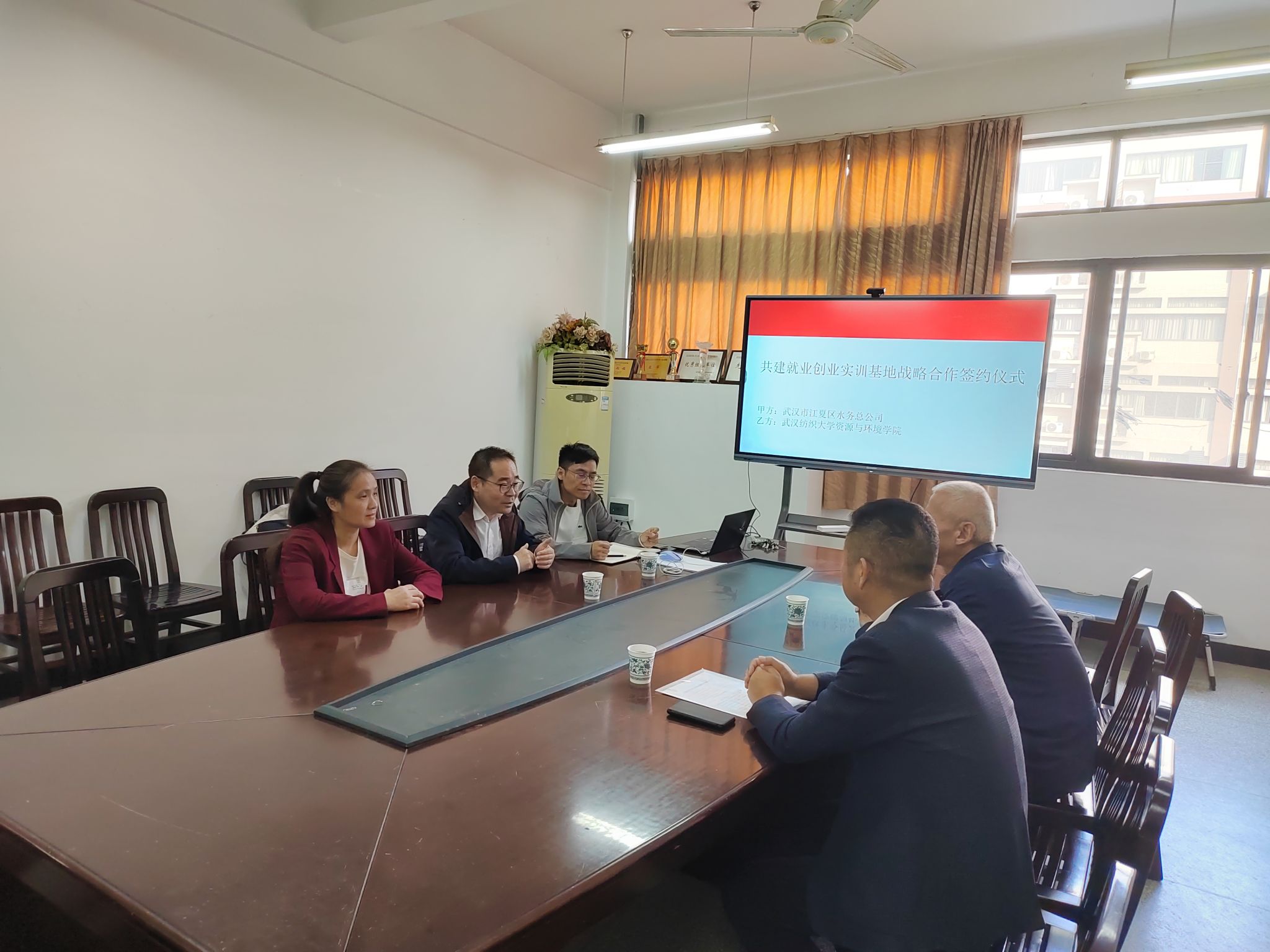 院长潘飞代表学院对王鉴生一行的到来表达了热烈的欢迎,并介绍了学院的相关情况。王鉴生代表江夏区水务总公司对学院的热情招待表示感谢,并介绍了公司的发展历史、基本情况,并建议双方可以加强专业实习等方面的合作交流。双方就实习基地建设,就业岗位提供,学科竞赛帮扶等方面进行了深入探讨交流,并签订了共建就业创业实训基地战略合作协议书。