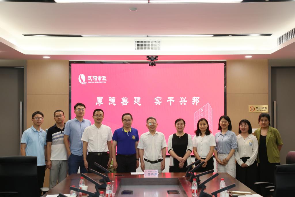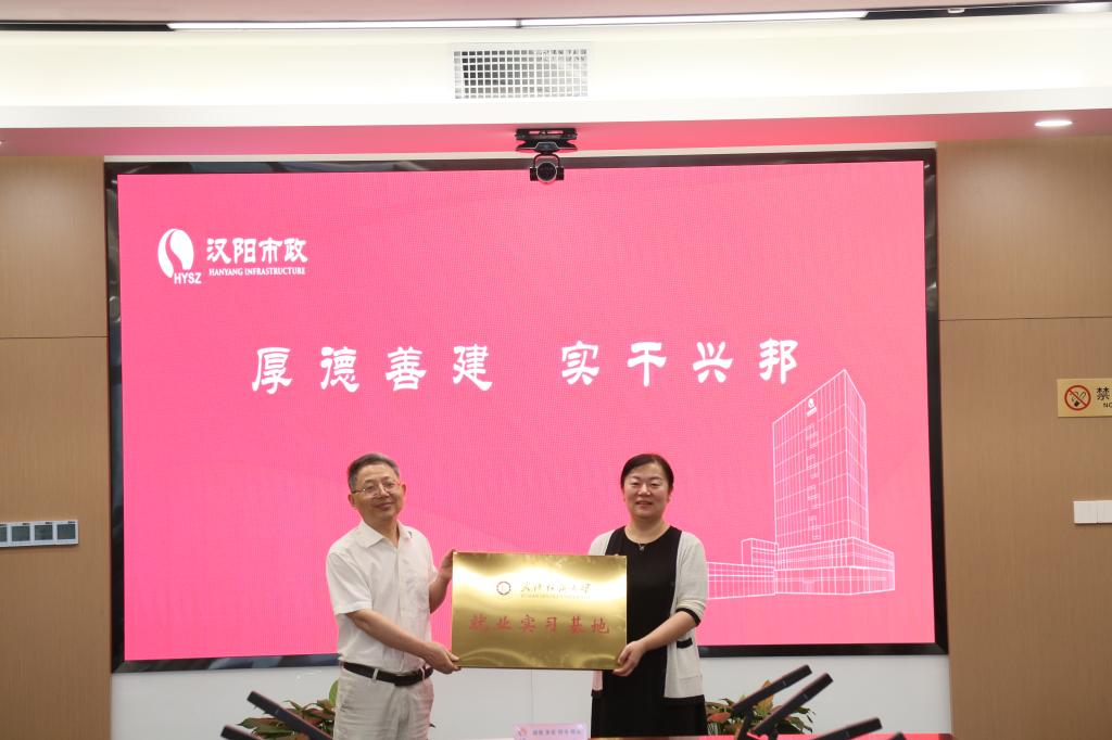 潘飞、张琴代表学校和汉阳市政集团签订了共建就业实习基地协议,唐敏为汉阳市政集团挂牌“就业实习基地”。