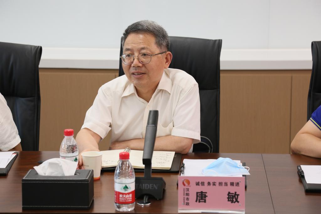 唐敏代表学校对汉阳市政集团在人才培养、毕业生就业等方面工作给予的支持表示了衷心的感谢,他表示汉阳市政集团七十年坚持奋斗,为国家和企业做出贡献,令人钦佩,是值得我们学习的。此次到访是学校落实教育部关于“稳就业”“保就业”相关要求的具体行动,是强化校企衔接,深化校企合作的重要途径,希望能与集团进一步深入交流合作,推荐更多优秀学生到集团开展实训学习,进一步提升实操能力,增强就业竞争力。潘飞、古江波、王腾分别介绍了环境学院、会计学院、科发院的基本情况。