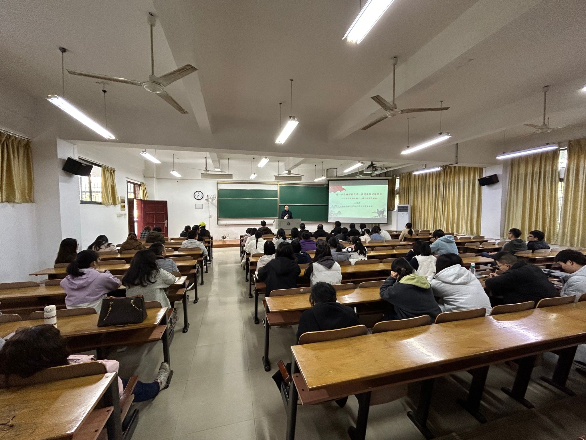 王海燕以《进一步全面深化改革、推进中国式现代化》为主题,从“深刻认识党的二十届三中全会的重大意义”“深入领会习近平总书记全会上的重要讲话精神”和“全面准确理解《决定》提出的进一步全面深化改革重大举措”三个方面,对全会精神进行了详细、深入的解读阐释。同时,结合学院实际,从教育、科技、人才角度,就坚持用改革精神推进学院工作与大家探讨。
