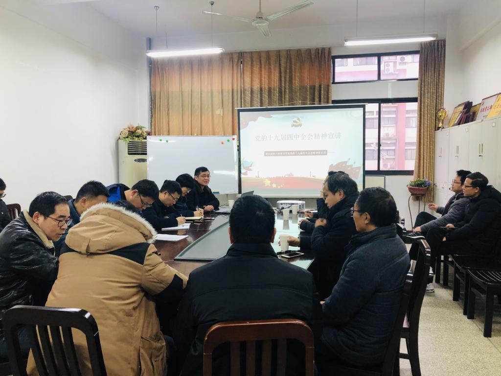 为深入学习宣传贯彻党的十九届四中全会精神,把广大党员干部师生思想统一到全会精神上来,把力量凝聚到实现党的十九届四中全会确定的各项任务中来。1月9日上午,学院学习贯彻党的十九届四中全会精神报告会在崇礼楼二楼会议室举行,学校宣讲团成员、纪委委员、纪委副书记、纪委办公室主任吴刚作了题为《全面从严治党:十九届四中全会精神解读》的辅导报告。学院班子成员、党委委员、系主任、“两办”人员、师生代表到场聆听,宣讲会由学院党委书记谢晓萍主持。