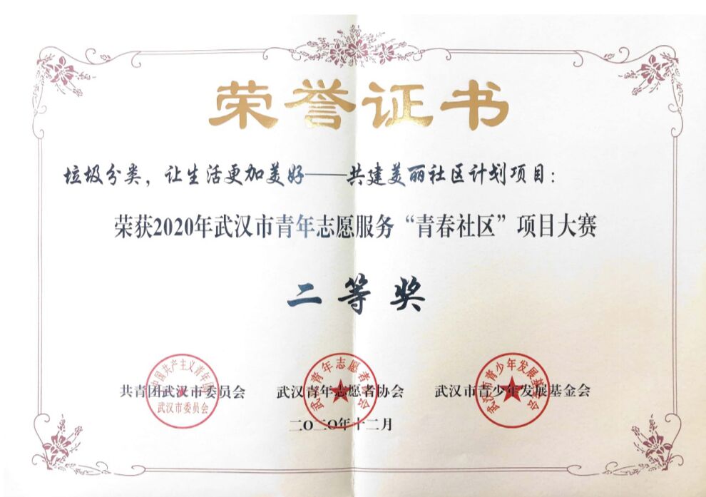 为贯彻落实习近平总书记关于志愿服务的重要指示精神,大力弘扬志愿服务精神,12月13日下午,由共青团武汉市委员会主办的2020年武汉青年志愿服务嘉年华在武汉市青少年宫隆重举行,会议表彰了2020年武汉市青年志愿服务“青春社区”优秀项目、“新青年下乡”活动十佳项目、第四届武汉青年学生艾滋病防治宣传活动先进集体、先进个人、优秀指导老师等。我院绿色环保协会的《垃圾分类,让生活更加美好——共建美丽社区》项目荣获“青春社区”项目大赛二等奖。