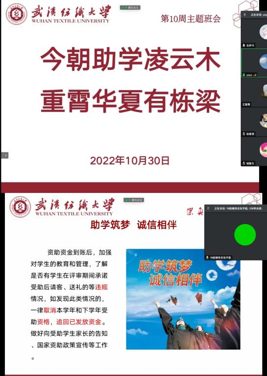 10月30日,学院全体辅导员分别组织各自年级全体同学召开线上年级大会和主题班会,会上,各年级辅导员带领同学们深入了解了什么是国家奖学金、国家励志奖学金、国家助学金和校奖学金,并详细说明了奖助学金的基本申请条件,申报评审的流程和要求,让全体同学对奖助学金评定流程及政策有了进一步清晰的认知,确保全体学生了解政策,推动资助工作公平公正公开开展。