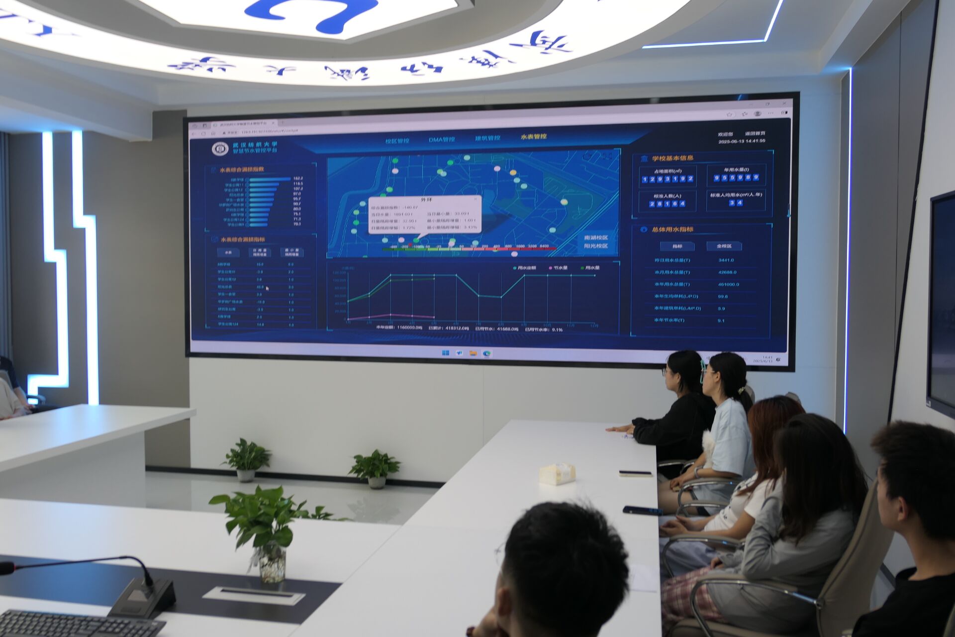 踏入智慧节水管控中心,一面数据大屏映入眼帘,上面跳动着数字与实时更新的图表呈现着全校的用水动态。点击鼠标,便能调取任意区域、建筑、水表终端的用水数据,从DMA分区监测到单栋楼宇用水分析,节水管理的每一个环节都在“云端”精准呈现。