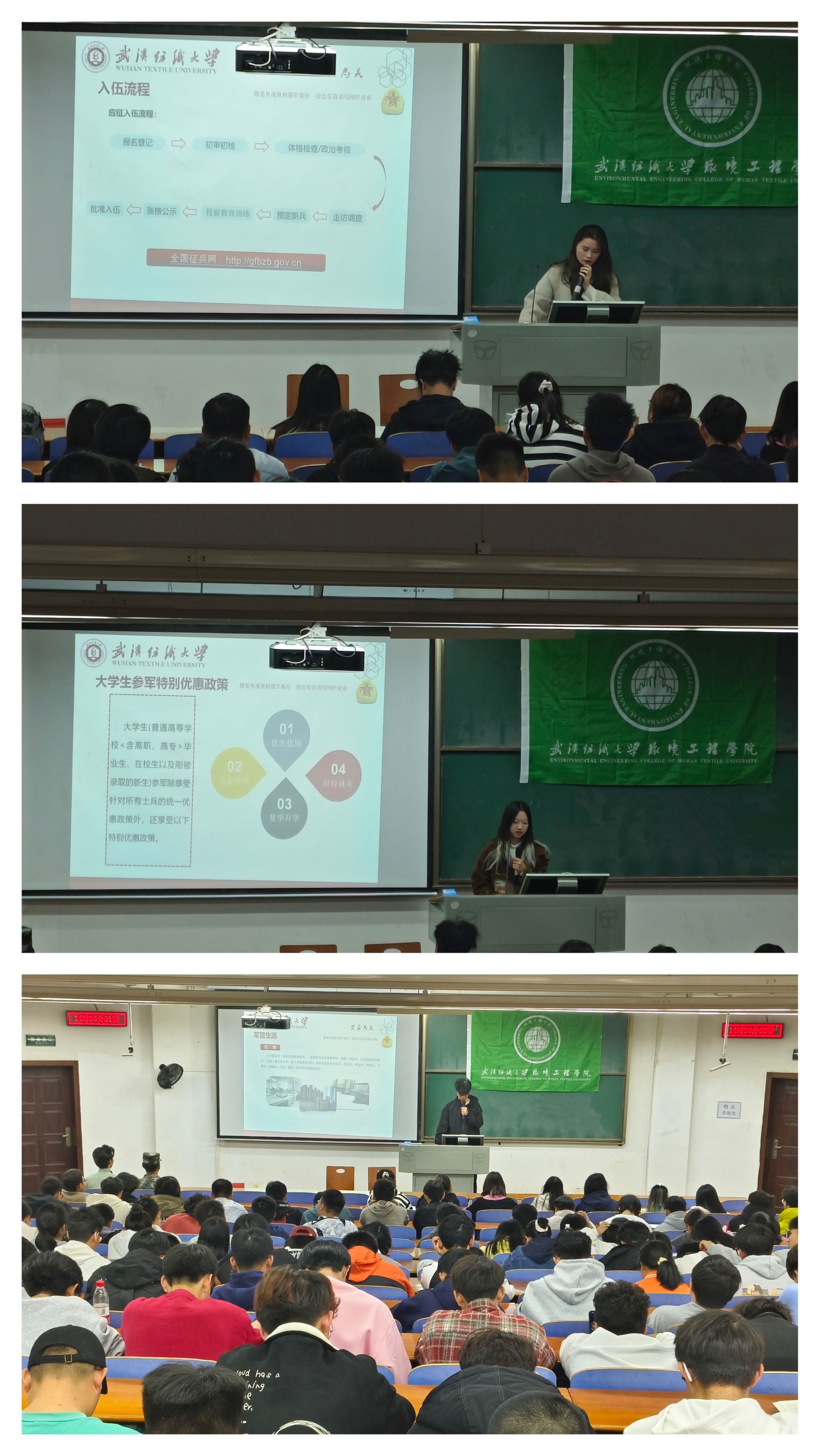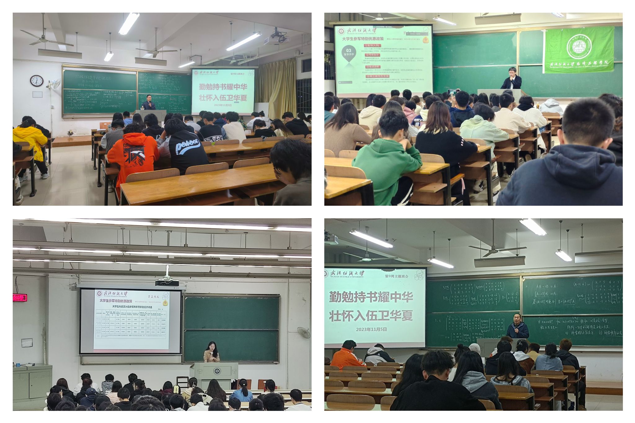 11月5日,副书记、各年级辅导员以年级大会的形式,向各同学们详细介绍了应征入伍的基本条件、入伍流程、大学生参军特别优惠政策及军营生活等内容,帮助同学们了解军旅生活和应征入伍的具体政策,引导和鼓励更多的同学积极投身军旅,锤炼品格、建功立业。