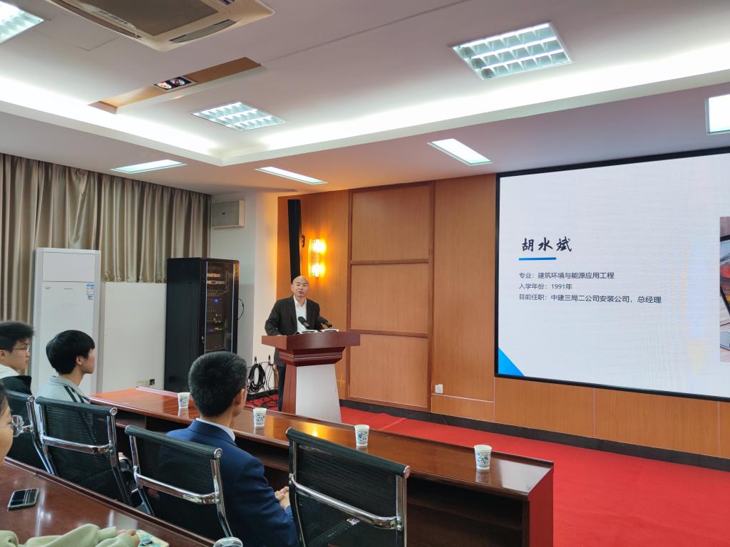 来自建筑环境与能源应用专业1991级的校友胡水斌,现任中建三局钢构科技公司安全总监,他以个人近30年的从业经历,给同学们讲了一堂精彩的生涯规划课。胡水斌鼓励同学们及早树立目标,用汗水浇灌梦想,用奋斗冲破迷茫,在实干中踏步前行。对于低年级同学,他建议要尽早完成学业规划,主动培养专业学习兴趣,打好坚实的专业基础,结合自己的志向、能力以及兴趣等综合评估,提前做好不同方向发展的信息储备,打牢发展基础;针对高年级同学,他建议同学们杜绝优柔寡断、虚耗时间,用不悔不休的意志,拿出抓铁有痕、踏石留印的执行力去完成既定目标。